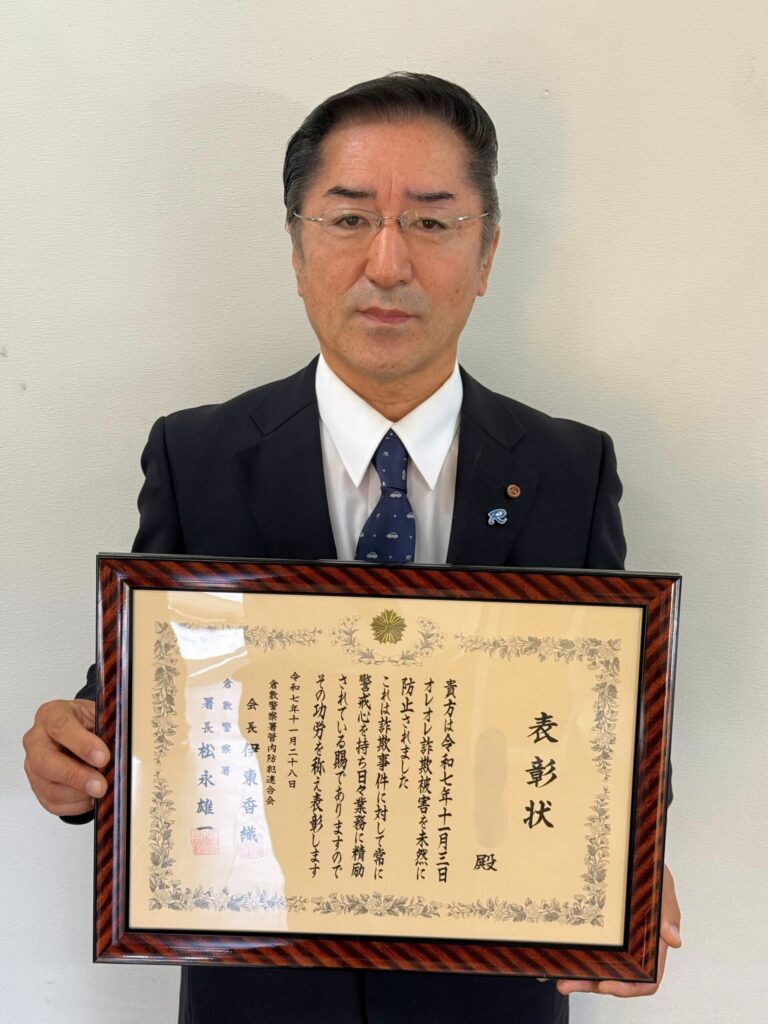 特殊詐欺被害を防止! 倉敷警察署から感謝状を頂きました