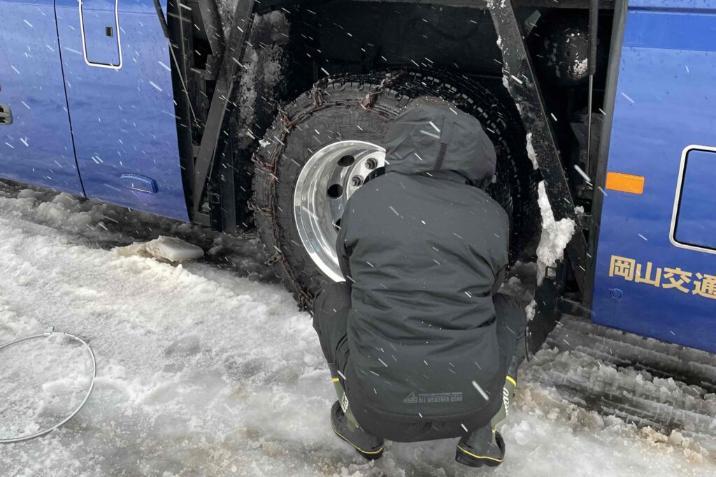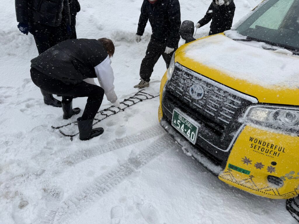 降りしきる雪の中、整備工場長や安全推進室所長、ベテラン社員が講師となり、タクシーとバスのチェーン着脱方法を丁寧に指導しました。